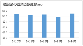 震災後の復興対策や景気対策による公共投資の増加により、建設業の就業者数が増加しています(下図)。